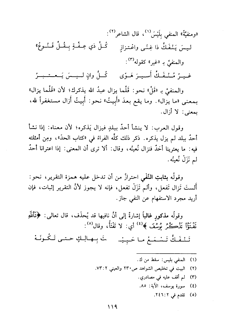 وقوله مذكور غالبًا إشارة إلى أن نافيها قد يحذف، قال تعالى: {تَاللَّهِ تَفْتَأُ تَذْكُرُ يُوسُفَ} أي: لا تفتأ، وقال: