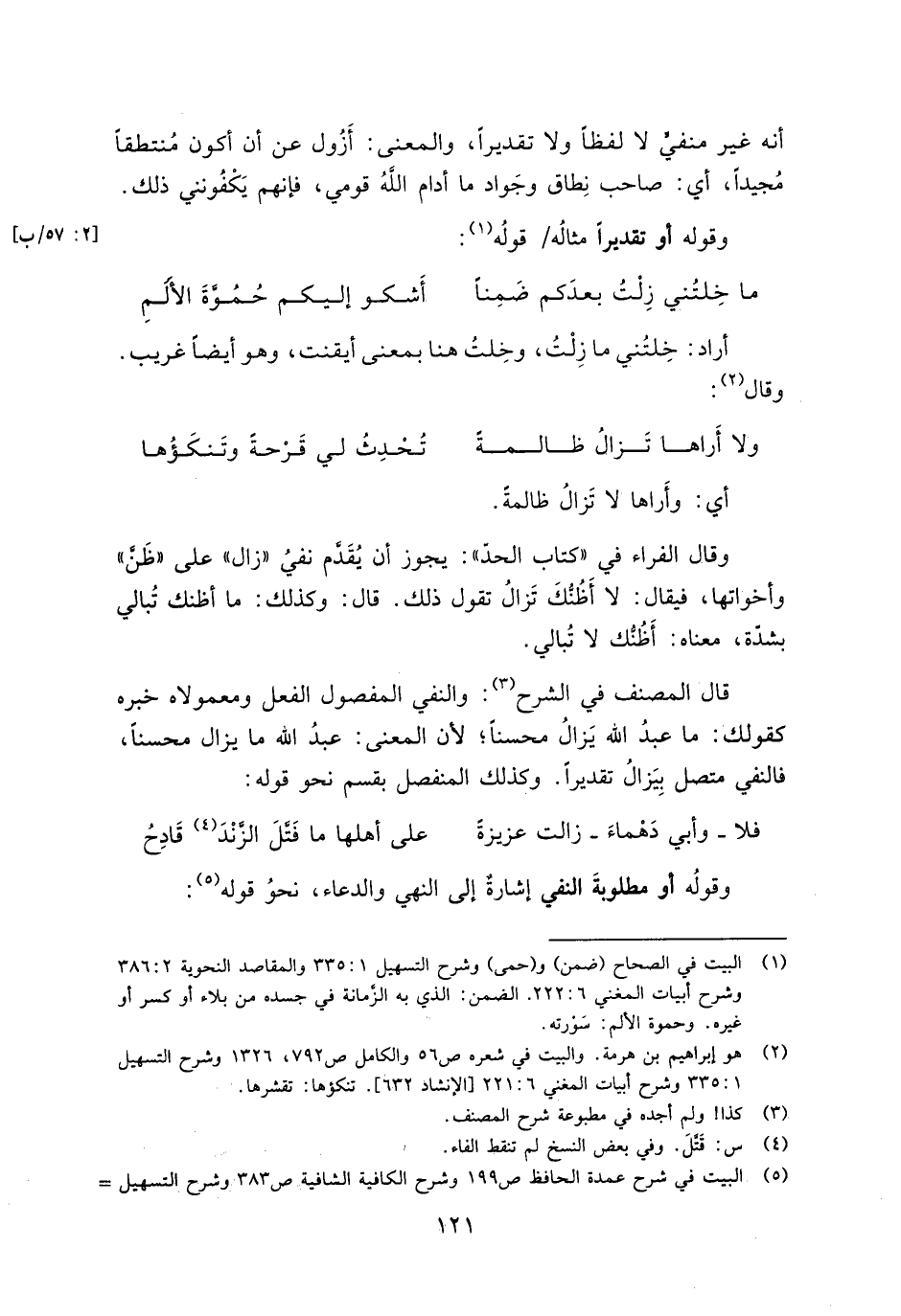 وقال الفراء في "كتاب الحد": يجوز أن يقدم نفي "زال" على "ظن" وأخواتها، فيقال: لا أظنك تزال تقول ذلك. قال: وكذلك: ما أظنك تبالي بشدة، معناه أظنك لا تبالي.