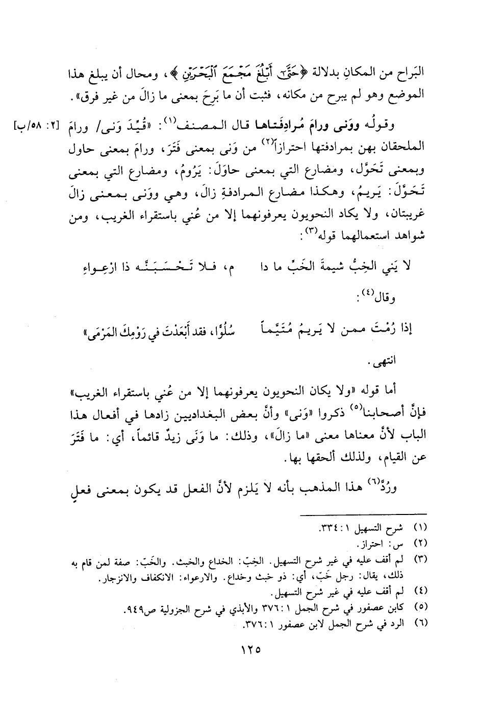 وقوله ووني ورام مرادفتاها قال المصنف: "قيد وني/ ورام الملحقان بهن بمرادفتها احترازًا من وني بمعنى فتر، ورام بمعنى حاول وبمعنى تحول، ومضارع التي بمعنى حاول: يروم، ومضارع التي بمعنى تحول: يريم، وهكذا مضارع المرادفة زال، وهي ووني بمعنى زال غريبتان، ولا يكاد النحويون يعرفونهما إلا من عني باستقراء الغريب، ومن شواهد استعمالهما قوله: