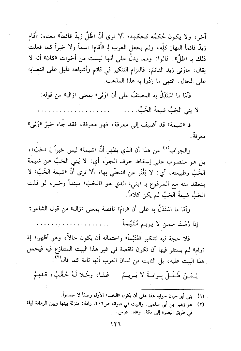 فلا حجة فيه لتنكير "متيمًا" واحتماله أن يكن حالًا، وهو أظهر؛ إذ "رام" لم يستقر فيها أن تكون ناقصة في غير هذا البيت المتنازع فيه فيحمل هذا البيت عليه، بل الثابت من لسان العرب أنها تامة كما قال: