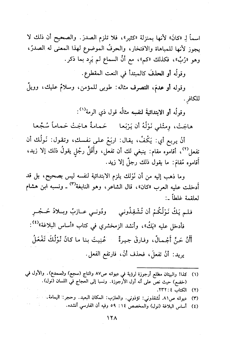 وما ذهب إليه من أن نولك يلزم الابتدائية لنفسه ليس بصحيح، بل قد أدخلت عليه العرب "كان" قال الشاعر، وهو النابغة -ونسبه ابن هشام لعلقمة غلطًا-: