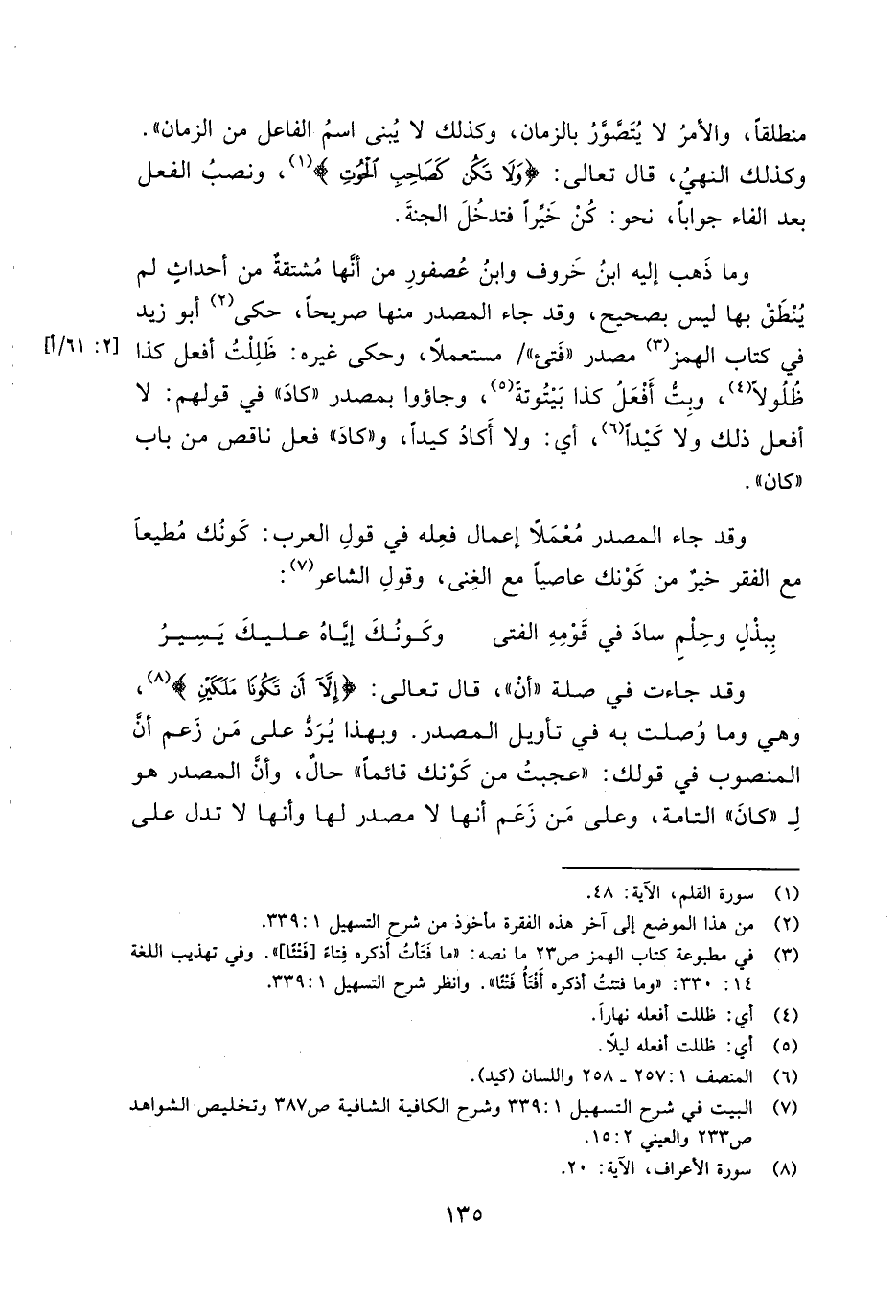 وما ذهب إليه ابن خروف وابن عصفور من أنها مشتقة من أحداث لم ينطق بها ليس بصحيح، وقد جاء المصدر منها صريحًا، حكى أبو زيد في كتاب الهمز مصدر "فتئ"/ مستعملًا، وحكى غيره: ظللت أفعل كذا ظلولًا، وبت أفعل كذا بيتوتة، وجاؤوا بمصدر "كاد" في قولهم: لا أفعل ذلك ولا كيدًا، أي: ولا أكاد كيدًا، و"كاد" فعل ناقص من باب "كان".