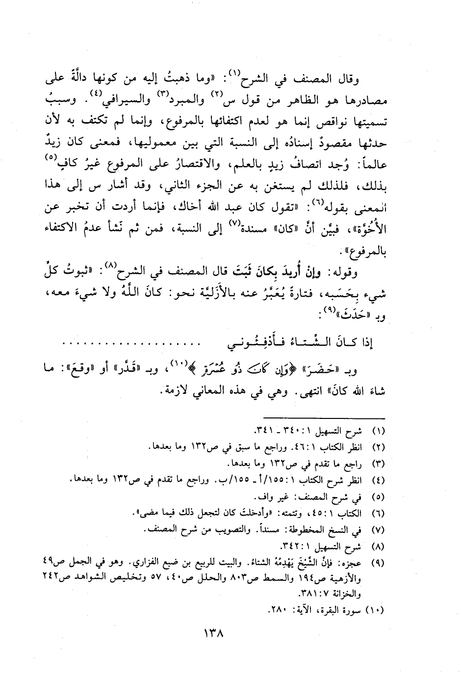 وقال المصنف في الشرح: "وما ذهبت إليه من كونها دالة على مصادرها هو الظاهر من قول س والمبرد والسيرافي. وسبب تسميتها نواقص إنما هو لعدم اكتفائها بالمرفوع، وإنما لم تكتف به لأن حدثها مقصود إسناده إلى النسبة التي بين معموليها، فمعنى كان زيد عالمًا: وجد اتصاف زيد بالعلم، والاقتصار على المرفوع غير كاف بذلك، فلذلك لم يستغن به عن الجزء الثاني، وقد أشار س إلى هذا المعنى بقوله: "تقول كان عبد الله أخاك، فإنما أردت أن تخبر عن الأخوة"، فبين أن "كان" مسندة إلى النسبة، فمن ثم نشأ عدم الاكتفاء بالمرفوع".