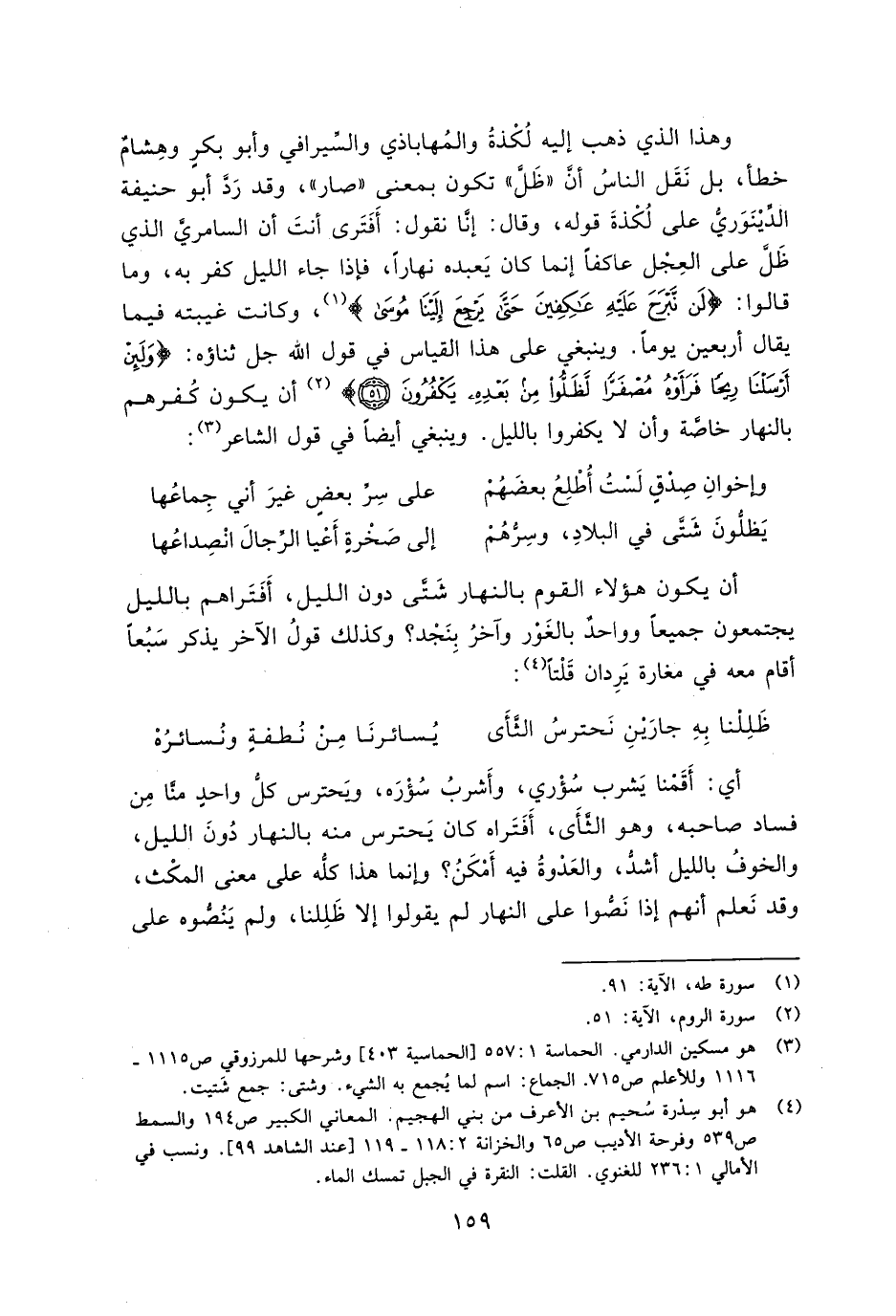 وهذا الذي ذهب إليه لكذة والمهاباذي والسيرافي وأبو بكر وهشام خطأ، بل نقل الناس أن "ظل" تكون بمعنى "صار"، وقد رد أبو حنيفة الدينوري على لكذة قوله، وقال: إنا نقول: أفترى أنت أن السامري الذي ظل على العجل عاكفًا إنما كان يعبده نهارًا، فإذا جاء الليل كفر به، وما قالوا: {لَن نَّبْرَحَ عَلَيْهِ عَاكِفِينَ حَتَّى يَرْجِعَ إلَيْنَا مُوسَى}، وكانت غيبته فيما يقال أربعين يومًا. وينبغي على هذا القياس في قول الله جل ثناؤه: {وَلَئِنْ أَرْسَلْنَا رِيحًا فَرَأَوْهُ مُصْفَرًّا لَّظَلُّوا مِنْ بَعْدِهِ يَكْفُرُونَ} أن يكون كفرهم بالنهار خاصة وأن لا يكفروا بالليل. وينبغي أيضًا في قول الشاعر: