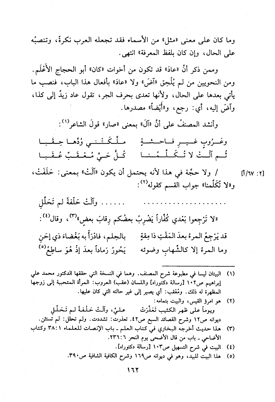 وممن ذكر أن "عاد" قد تكون من أخوات "كان" أبو الحجاج الأعلم. ومن النحويين من لم يلحق "آض" ولا "عاد" بأفعال هذا الباب، فنصب ما يأتي بعدها على الحال، ولأنها تعدي بحرف الجر، تقول عاد زيد إلى كذا، وآض إليه، أي: رجع، و"أيضًا" مصدرها.