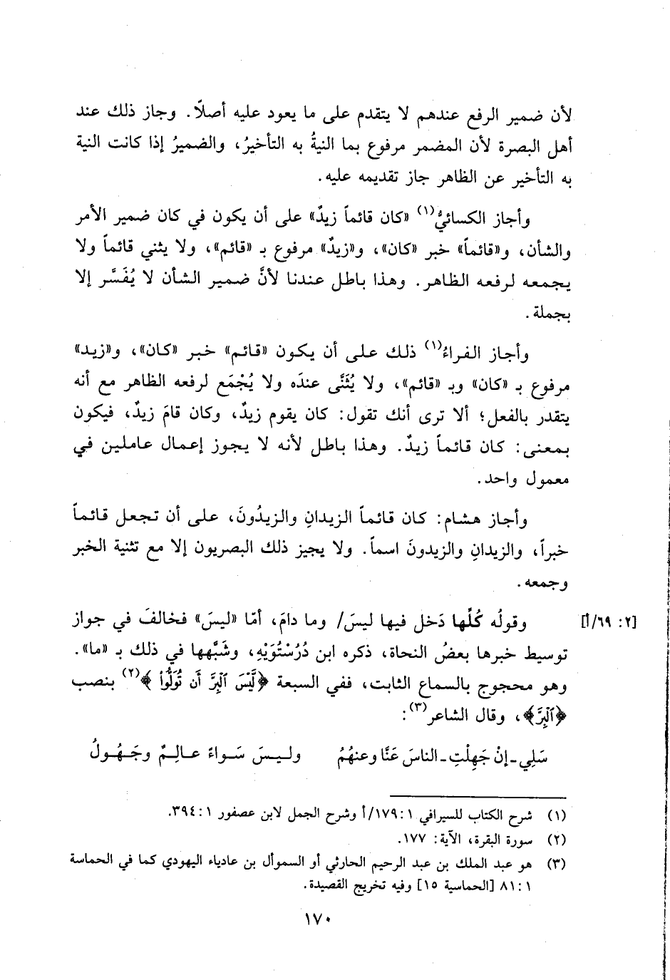 وأجاز هشام: كان قائما الزيدان والزيدون، على أن تجعل قائما خبرا، والزيدان والزيدون اسما. ولا يجيز ذلك البصريون إلا مع تثنية الخبر وجمعه.