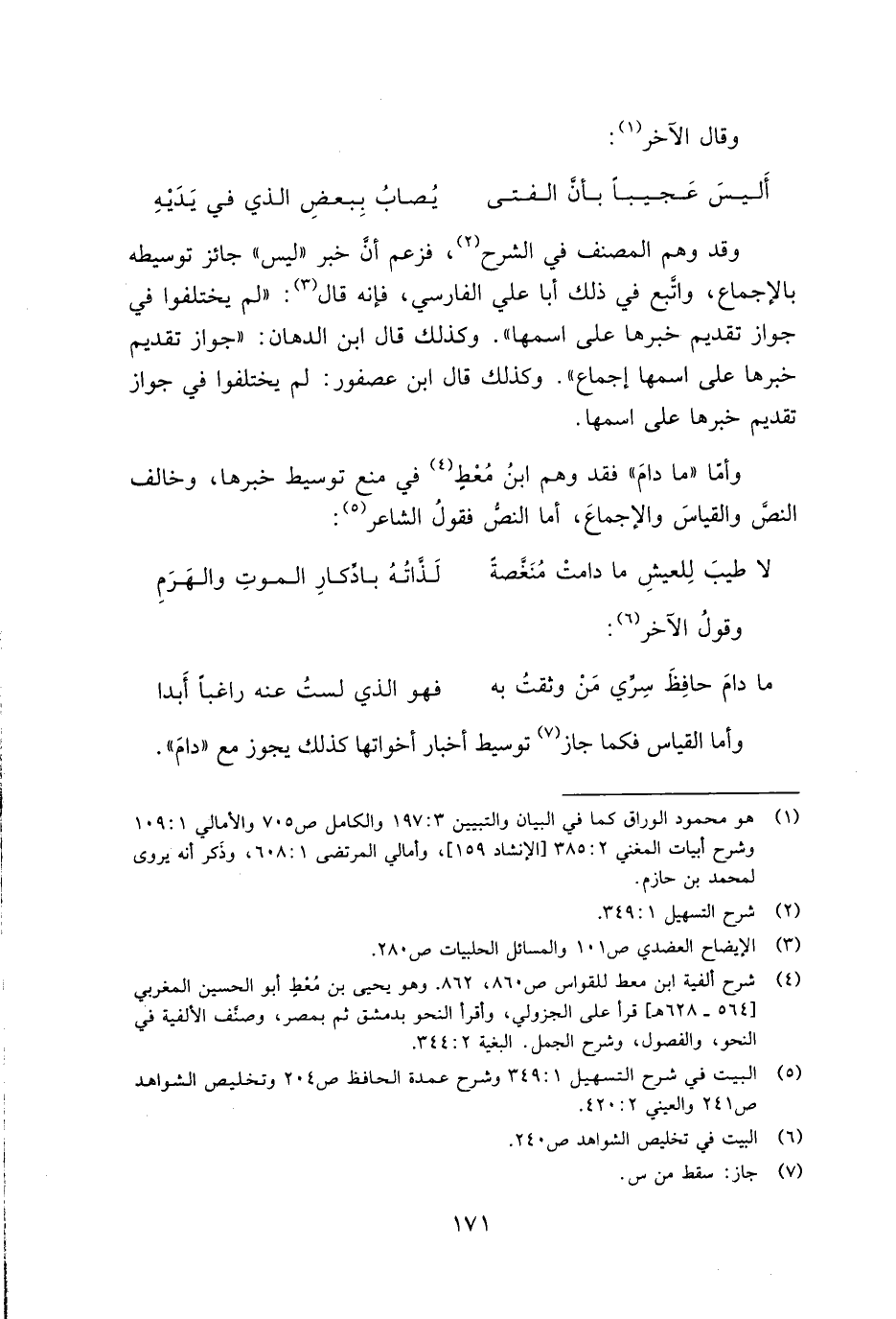 وأما "ما دام" فقد وهم ابن مُعط في منع توسيط خبرها، وخالف النص والقياس والإجماع، أما النص فقول الشاعر: