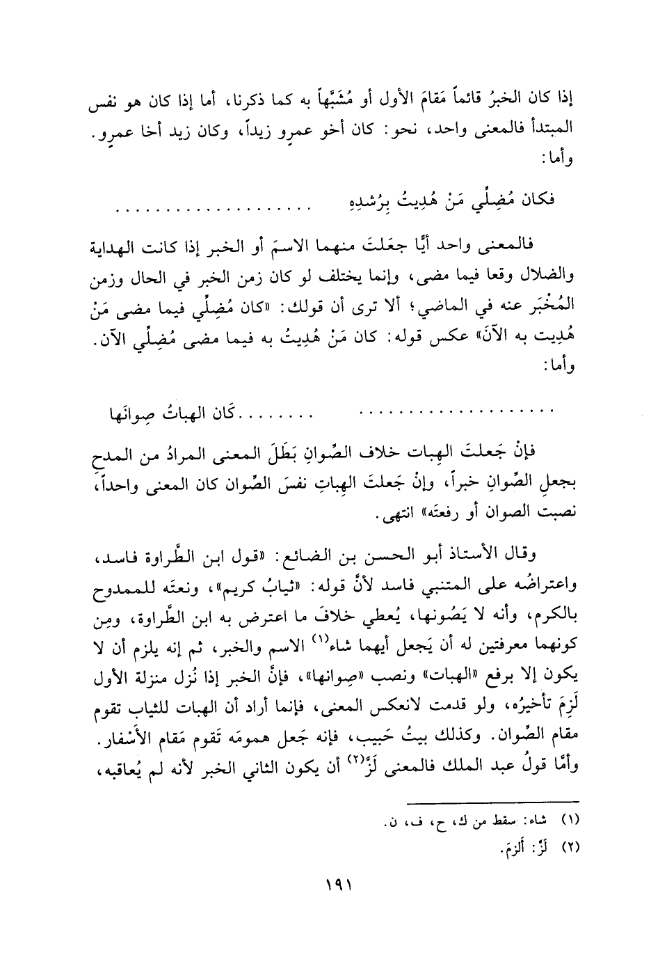 وقال الأستاذ أبو الحسن بن الضائع: " قول ابن الطراوة فاسد، واعتراضه على المتنبي فاسد لأن قوله: "ثياب كريم"، ونعته للممدوح بالكرم، وأنه لا يصونها، يُعطي خلاف ما اعترض به ابن الطراوة، ومن كونهما معرفتين له أن يجعل أيهما شاء الاسم والخبر، ثم إنه يلزم أن لا يكون إلا برفع "الهبات" ونصب "صوانها"، فإن الخبر إذا نُزل منزلة الأول لزم تأخيره، ولو قدمت لانعكس المعنى، فإنما أراد أن الهبات للثياب تقوم مقام الصوان. وكذلك بيت حبيب، فإنه جعل همومه تقوم مقام الأسفار. وأما قول عبد الملك فالمعنى لز أن يكون الثاني الخبر لأنه لم يُعاقبه،