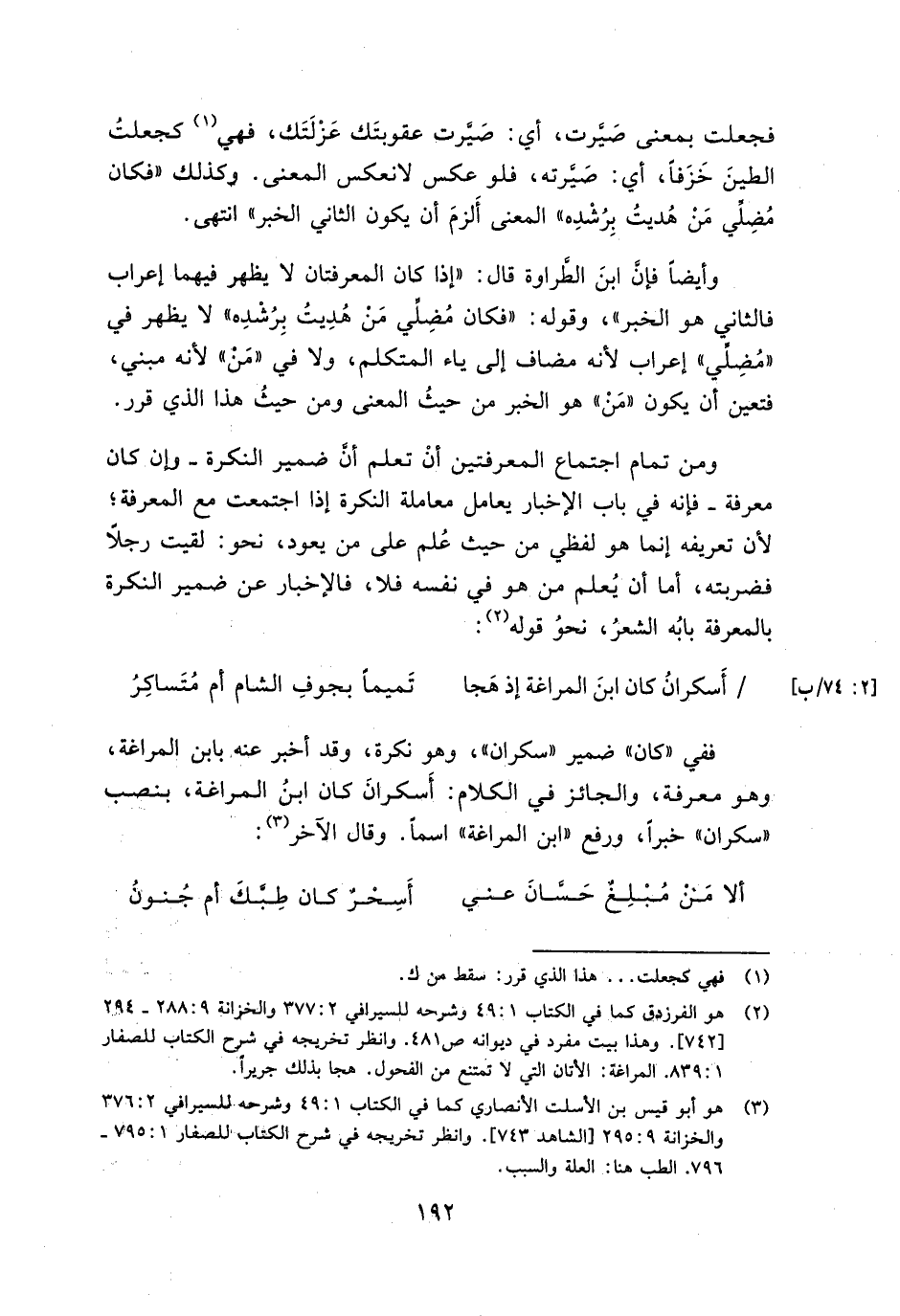 ففي "كان" ضمير "سكران"، وهو نكرة، وقد أخبر عنه بابن المراغة، وهو معرفة، والجائز في الكلام: أسكران كان ابن المراغة، بنصب "سكران" خبرًا، ورفع "ابن المراغة" اسمًا. وقال الآخر: