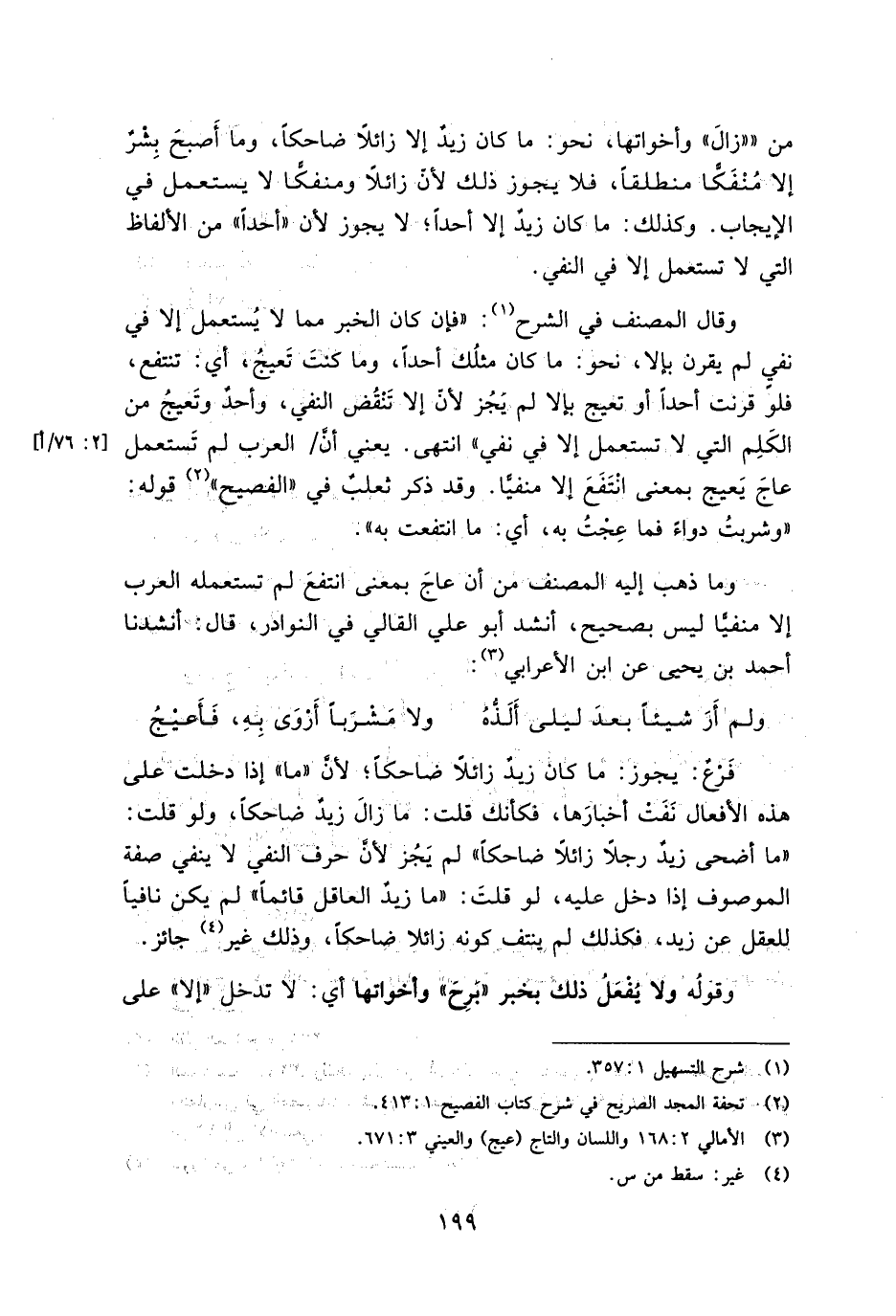 فرع: يجوز: ما كان زيد زائلًا ضاحكًا؛ لأن "ما" إذا دخلت على هذه الأفعال نفت أخبارها، فكأنك قلت: ما زال زيد ضاحكًا، ولو قلت "ما أضحى زيد رجلًا زائلًا ضاحكًا" لم يجز لأن حرف النفي لا ينفي صفة الموصوف إذا دخل عليه، لو قلت: "ما زيد العاقل قائمًا" لم يكن نافيًا للعقل عن زيد، فكذلك لم ينتف كونه زائلًا ضاحكًا، وذلك غير جائز.