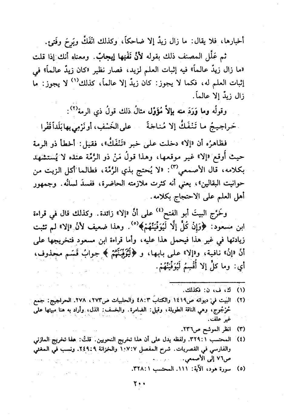 فظاهره أن "إلا" دخلت على خبر "تنفك"، فقيل: أخطأ ذو الرمة حيث أوقع "إلا" غير موقعها، وهذا قول من ذو الرمة عنده لا يُستشهد بكلامه، قال الأصمعي: "لا يُحتج بذي الرمة، فطالما أكل الزيت من حوانيت البقالين"، يعني أنه كثرت ملازمته الحاضرة، ففسد لسانه. وجمهور أهل العلم على الاحتجاج بكلامه.