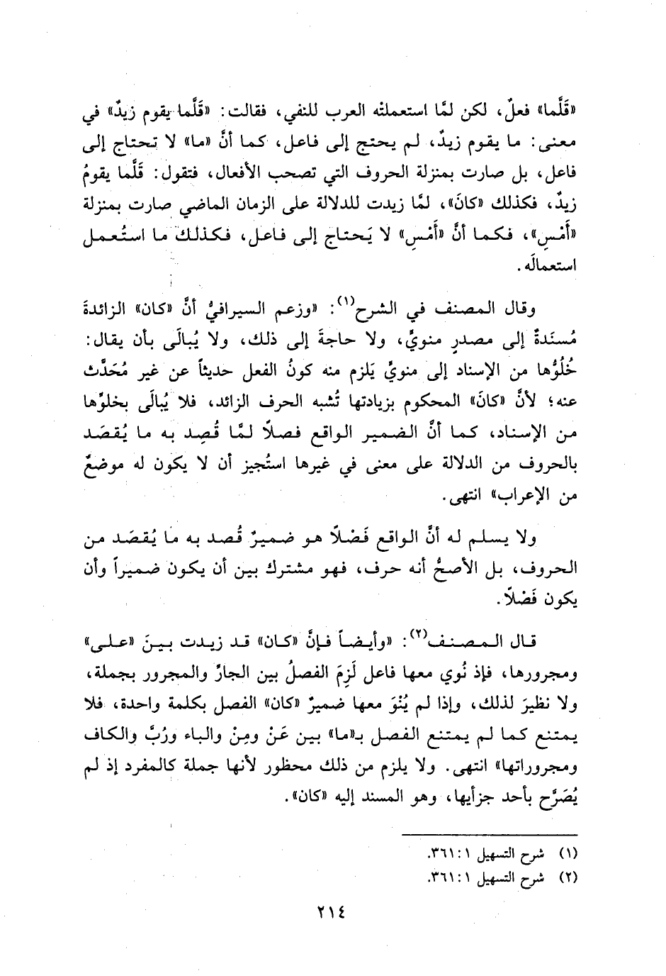 وقال المصنف في الشرح: "وزعم السيرافي أن "كان" الزائدة مسندة إلى مصدر منوي, ولا حاجة إلى ذلك, ولا يبالي بأن يقال: خلوها من الإسناد إلى منوي يلزم منه كون الفعل حديثًا عن غير محدث عنه, لأن "كان" المحكوم بزيادتها تشبه الحرف الزائد, فلا يبالي بخلوها من الإسناد, كما أن الضمير الواقع فصلًا لما قصد به ما يقصد بالحروف من الدلالة على معنى في غيرها استجيز أن لا يكون له موضع من الإعراب" انتهى.
