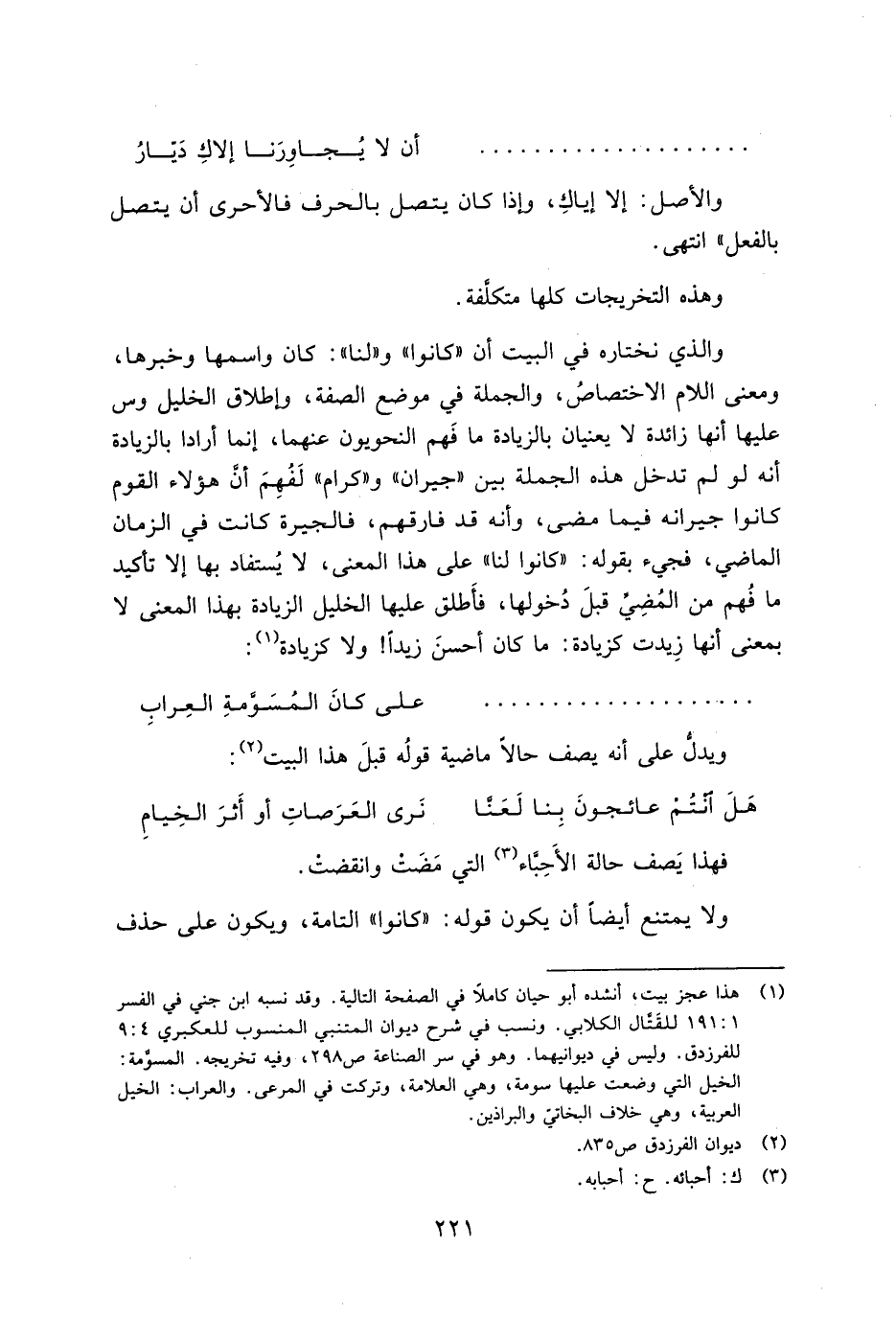 والذي نختاره في البيت أن "كانوا" و"لنا": كان واسمها وخبرها، ومعني اللام الاختصاص، والجملة في موضع الصفة، وإطلاق الخليل وس عليها أنها زائدة لا يعنيان بالزيادة ما فهم النحويون عنهما، إنما أرادا بالزيادة أنه لو لم تدخل هذه الجملة بين "جيران" و"كرام" لفهم أن هؤلاء القوم كانوا جيرانه فيما مضي، وأنه قد فارقهم، فالجيرة كانت في الزمان الماضي، فجئ بقوله: "كانوا لنا" علي هذا المعني، لا يستفاد بها إلا تأكيد ما فهم من المضي قبل دخولها، فأطلق عليها الخليل الزيادة بهذا المعني لا بمعني أنها زيدت كزيادة: ما كان أحسن زيدا! ولا كزيادة: