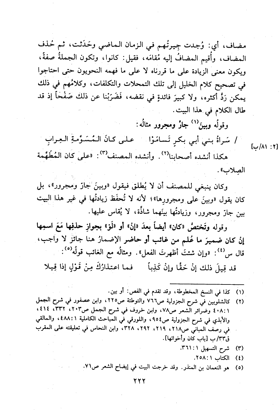 مضاف، أي: وجدت جيرتهم في الزمان الماضي وحدثت، ثم حذف المضاف، وأقيم المضاف إليه مقامه، فقيل: كانوا، وتكون الجملة صفة، ويكون معني الزيادة علي ما قررناه لا علي ما فهمه النحويون حتي احتاجوا في تصحيح كلام الخليل إلي تلك التمحلات والتكلفات، وكلامهم في ذلك يمكن رد أكثره، ولا كبير فائدة في نقضه، فضربنا عن ذلك صفحا إذ قد طال الكلام في هذا البيت.
