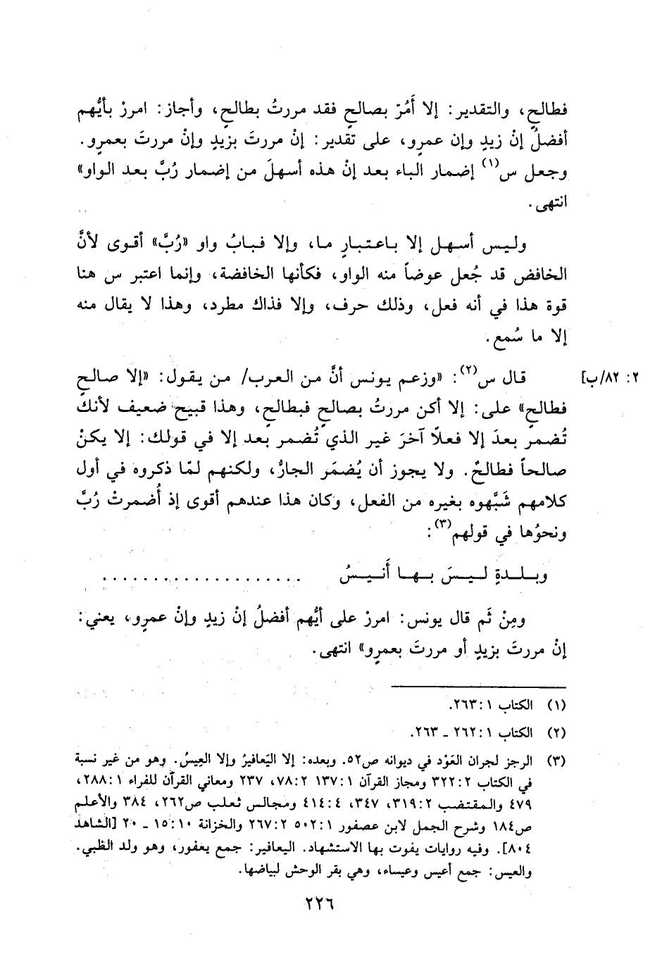 فطالح، والتقدير: إلا أمر بصالح فقد مررت بطالح، وأجاز: امرر بأيهم أفضل إن زيد وإن عمرو، علي تقدير: إن مررت بزيد وإن مررت بعمرو. وجعل س إضمار الباء بعد إن هذه أسهل من إضمار رب بعد الواو" انتهي.