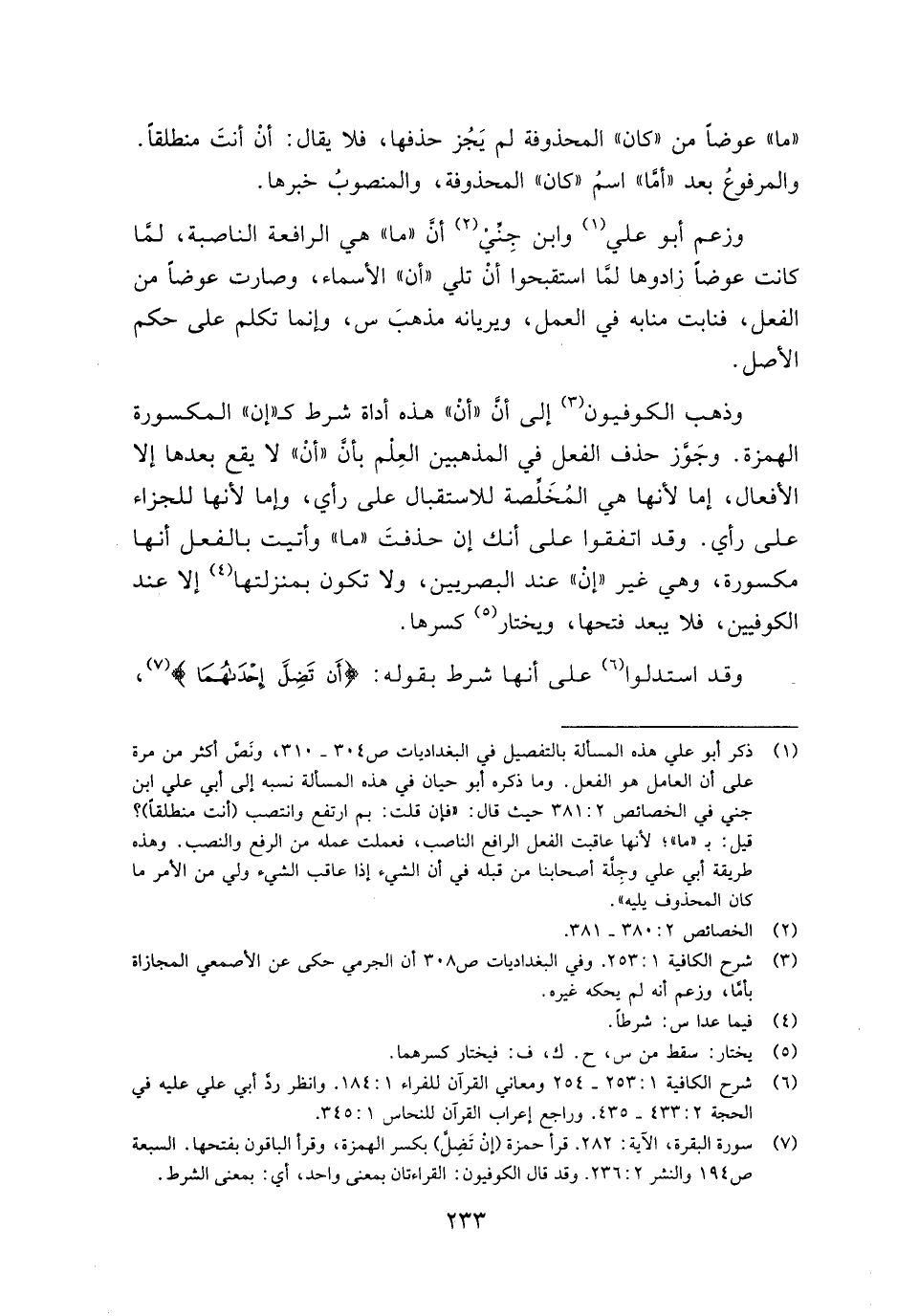 وذهب الكوفيون إلي أن "أن" هذه أداة شرط كـ"إن" المكسورة الهمزة. وجوز حذف الفعل في المذهبين العلم بأن "أن" لا يقع بعدها إلا الأفعال، إما لأنها هي المخلصة للاستقبال علي رأي، وإما لأنها للجزاء علي رأي. وقد اتفقوا علي أنك إن حذفت "ما" وأتيت بالفعل أنها مكسورة، وهي غير "إن" عند البصريين، ولا تكون بمنزلتها إلا عند الكوفيين، فلا يبعد فتحها، ويختار كسرها.