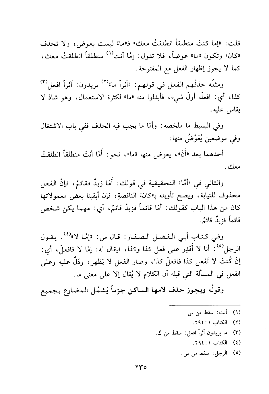 قلت: "إما كنت منطلقا انطلقت معك" فـ"ما" ليست بعوض، ولا تحذف "كان" وتكون "ما" عوضا، فلا تقول: إما أنت منطلقا انطلقت معك, كما لا يجوز إظهار الفعل مع المفتوحة.