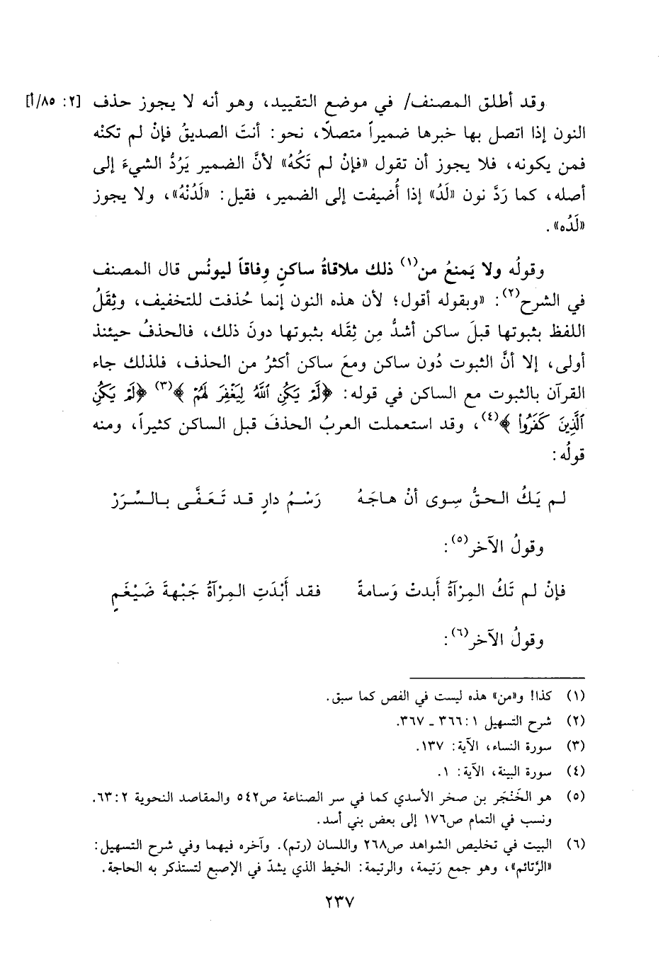 وقوله ولا يمنع من ذلك ملاقاة ساكن وفاقا ليونس قال المصنف في الشرح: "وبقوله أقول؛ لأن هذه النون إنما حذفت للتخفيف, وثقل اللفظ بثبوتها قبل ساكن أشد من ثقله بثبوتها دون ذلك, فالحذف حينئذ أولي, إلا أن الثبوت دون ساكن ومع ساكن أكثر من الحذف, فلذلك جاء القرآن بالثبوت مع الساكن في قوله: {لَّمْ يَكُنِ اللهُ لِيَغْفِرَ لَهُمْ} {لَمْ يَكُنِ الَّذِينَ كَفَرُوا} , وقد استعملت العرب الحذف قبل الساكن كثيرا, ومنه قوله: