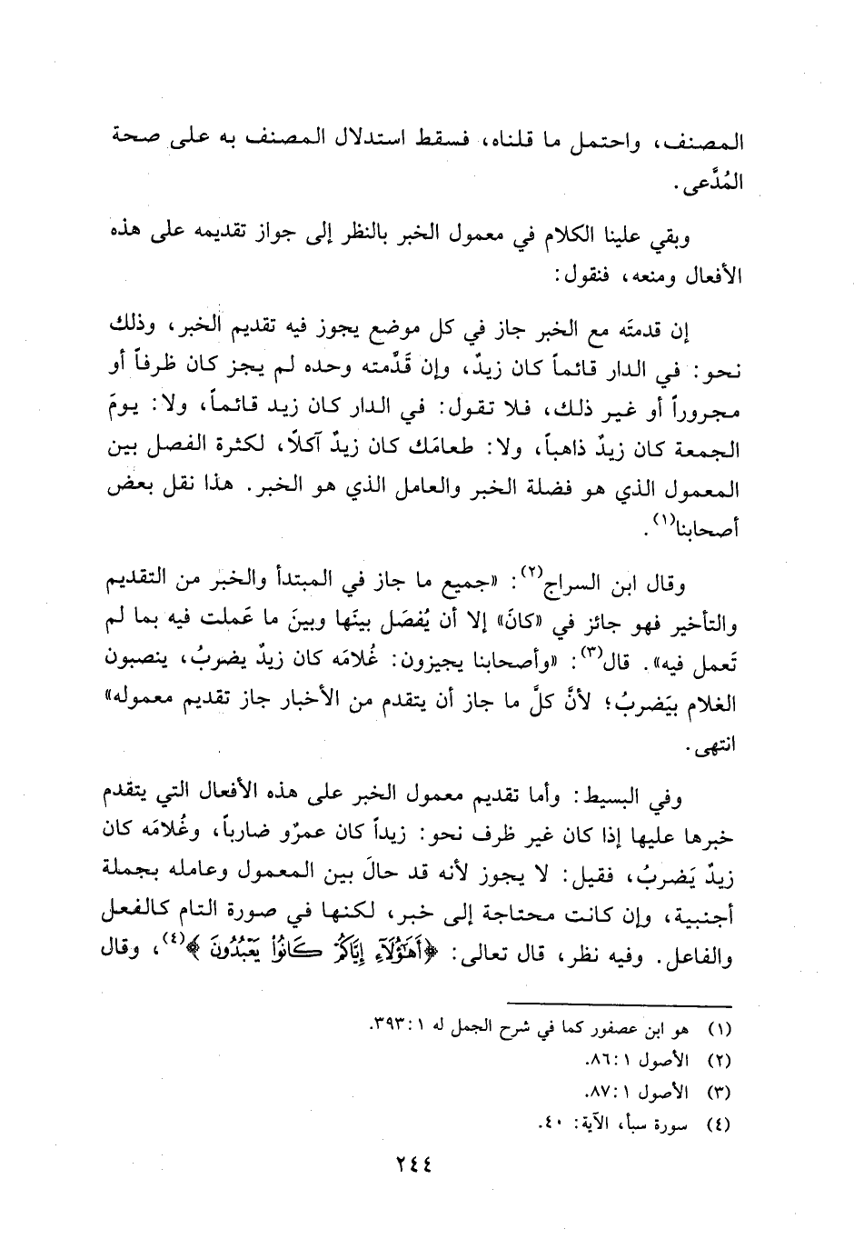 وفي البسيط: وأما تقديم معمول الخبر على هذه الأفعال التي يتقدم خبرها عليها إذا كان غير ظرف نحو: زيداً كان عمرٌو ضاربًا، وغلامَه كان زيدٌ يَضربُ، فقيل: لا يجوز لأنه قد حالَ بين المعمول وعامله بجمله أجنبية، وإن كانت محتاجة إلى خبر، لكنها في صورة التام كالفعل والفاعل. وفيه نظر، قال تعالى {أَهَؤُلَاءِ إِيَّاكُمْ كَانُوا يَعْبُدُونَ}، وقال