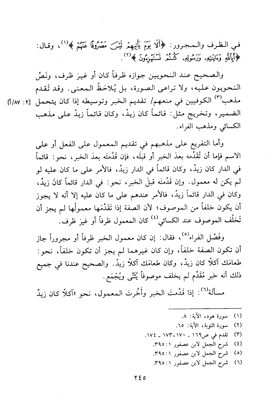 في الظرف والمجرور: {أَلَا يَوْمَ يَاتِيهِمْ لَيْسَ مَصْرُوفًا عَنْهُمْ}، وقال: {أَبِاللَّهِ وَآَيَاتِهِ وَرَسُولِهِ كُنْتُمْ تَسْتَهْزِئُونَ}.