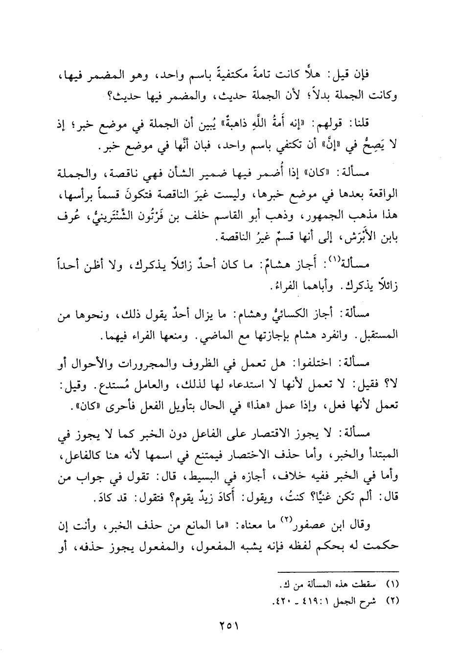 مسألة: "كان" إذا أضمر فيها ضمير الشأن فهي ناقصة، والجملة الواقعة بعدها في موضع خبرها، وليست غير الناقصة فتكون قسمًا برأسها، هذا مذهب الجمهور، وذهب أبو القاسم خلف بن فرتون الشنتريني، عرف بابن الأبرش، إل أنها قسم غير الناقصة.
