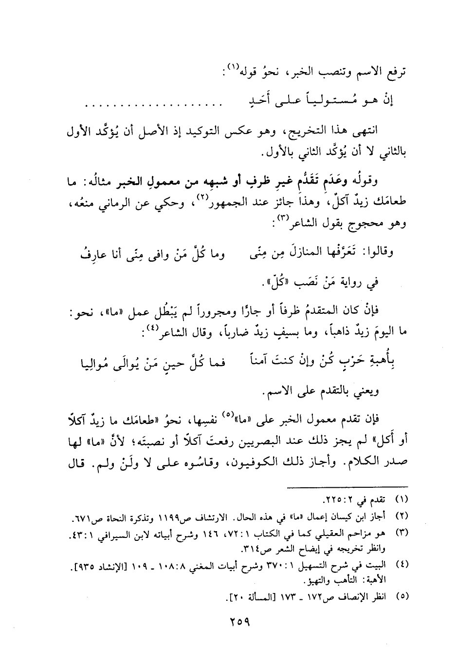 وقوله وعدم تقدم غير ظرف أو شبهه من معمول الخبر مثاله: ما طعامك زيد آكل، وهذا جائز عند الجمهور، وحكي عن الرماني منعه، وهو محجوج بقول الشاعر: