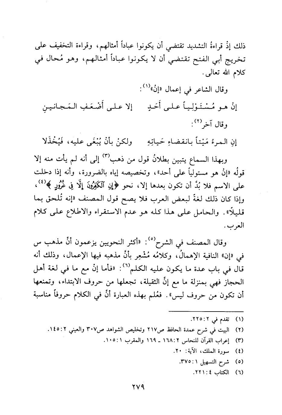 وقال المصنف في الشرح: "أكثر النحويين يزعمون أن مذهب س في "إن" النافية الإهمال، وكلامه مشعر بأن مذهبه فيها الإعمال، وذلك أنه قال في باب عدة ما يكون عليه الكلم: "فأما إن مع ما في لغة أهل الحجاز فهي بمنزلة ما مع إن الثقيلة، تجعلها من حروف الابتداء، وتمنعها أن تكون حروف ليس". فعلم بهذه العبارة أن في الكلام حروفًا مناسبة