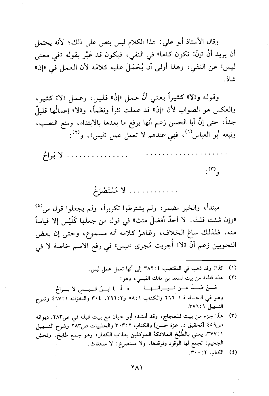 وقال الأستاذ أبو علي: هذا الكلام ليس بنص على ذلك؛ لأنه يحتمل أن يريد أن "إن" تكون ك"ما" في النفي، فيكون قد عبر بقوله "في معنى ليس" عن النفي، وهذا أولى أن يحمل عليه كلامه لأن العمل في "إن" شاذ.