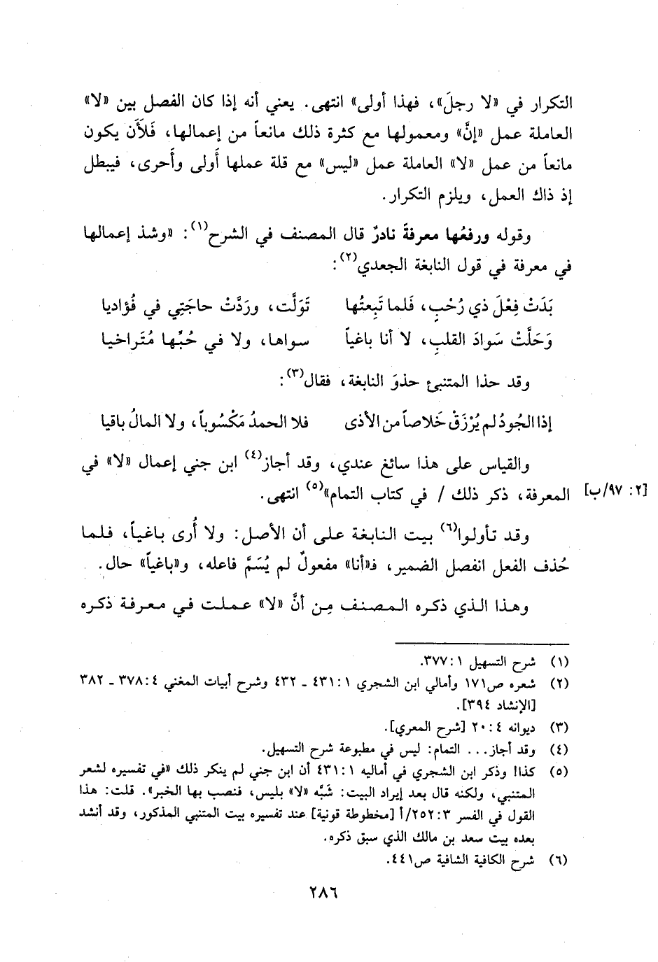 والقياس على هذا سائغ عندي، وقد أجاز ابن جني إعمال "لا" في المعرفة، ذكر ذلك / في كتاب التمام " انتهى.