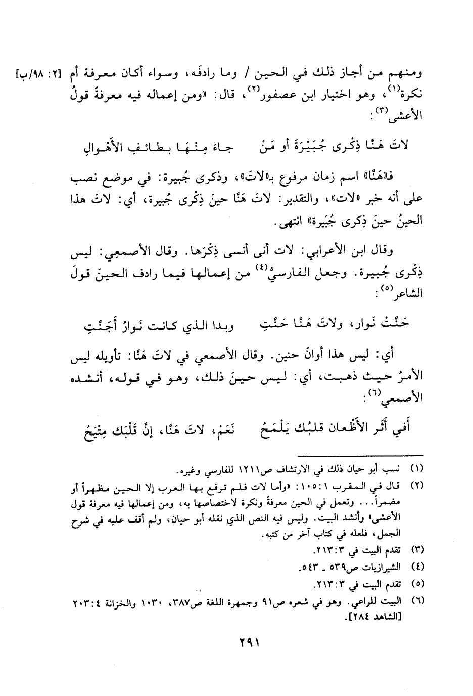 وقال ابن الأعرابي: لات أني أنسى ذكرها. وقال الأصمعي: ليس ذكرى جبيرة. وجعل الفارسي من إعمالها فيما رادف الحين قول الشاعر: