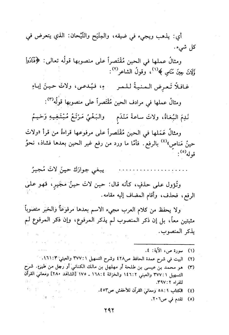 ومثال عملها في الحين مقتصراً على منصوبها قوله تعالى: {فَنَادَوْا وَلاتَ حِينَ مَنَاصٍ} وقول الشاعر: