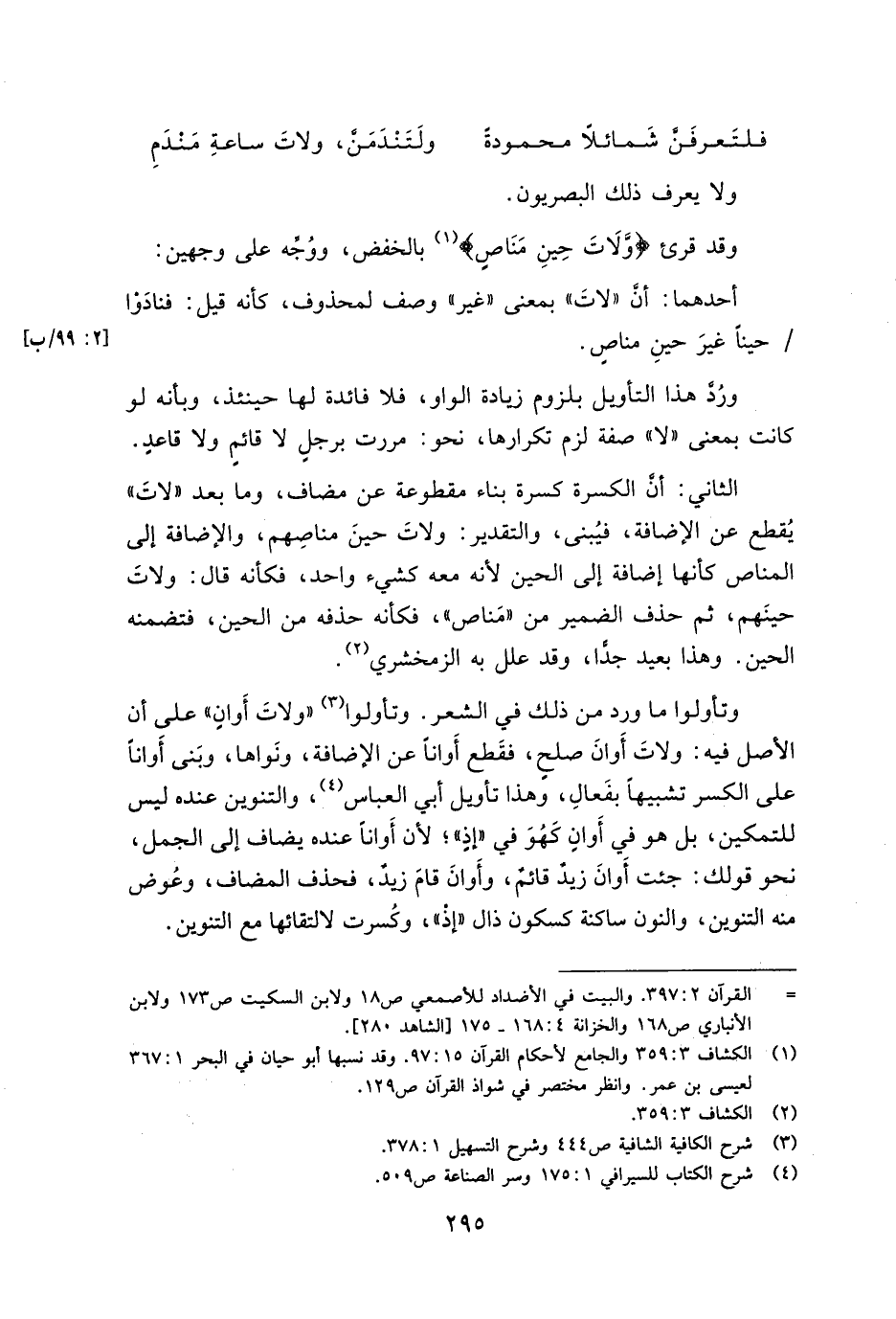 الثاني: أن الكسرة كسرة بناء مقطوعة عن مضاف, وما بعد"لات" يقطع عن الإضافة فيبنى والتقدير: ولات حين مناصهم, والإضافة إلى المناص كأنها إضافة إلى الحين لأنه معه كشيء واحد, فكأنه قال: ولات حينهم, ثم حذف الضمير من "مناص" فكأنه حذفه من الحين, فتضمنه الحين. وهذا بعيد جداً وقد علل به الزمخشري.