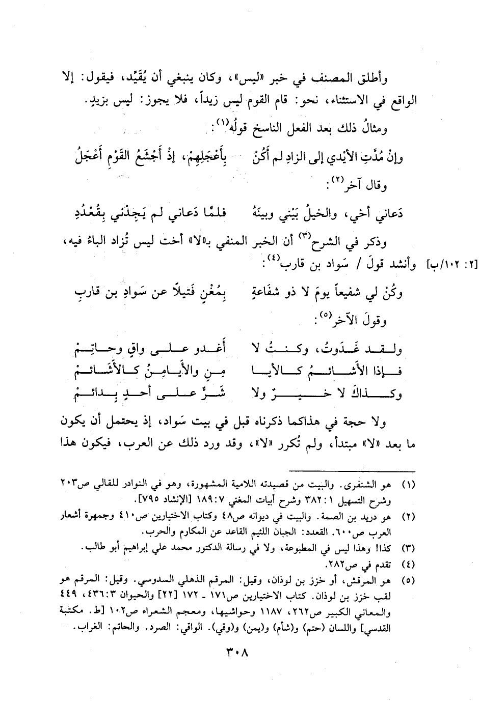 ولا حجة في هذا كما ذكرناه قبل في بيت سواد, إذ يحتمل أن يكون ما بعد "لا" مبتدأ ولم تكرر"لا" وقد ورد ذلك عن العرب فيكون هذا