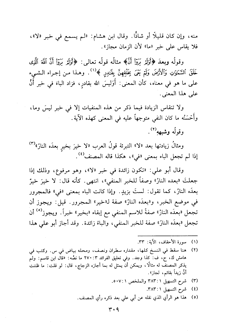 منه, وإن كان قليلاً أو شاذاً. وقال ابن هشام:" لم يسمع في خبر"لا" فلا يقاس على خبر "ما" لأن الزمان مجاز".