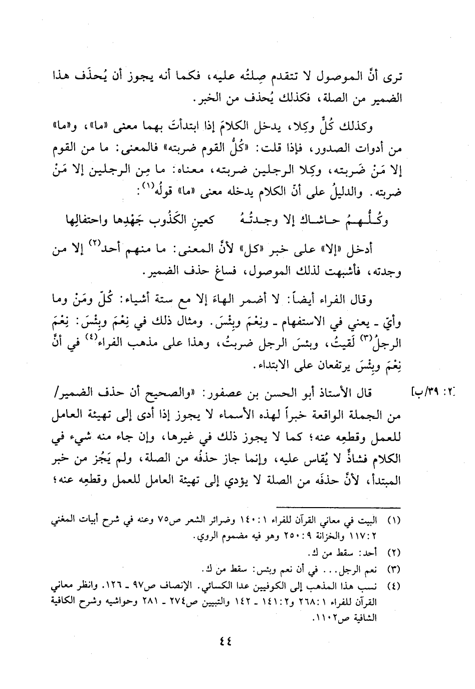 ترى أن الموصول لا تتقدم صلته عليه، فكما أنه يجوز أن يحذف هذا الضمير من الصلة، فكذلك يحذف من الخبر.