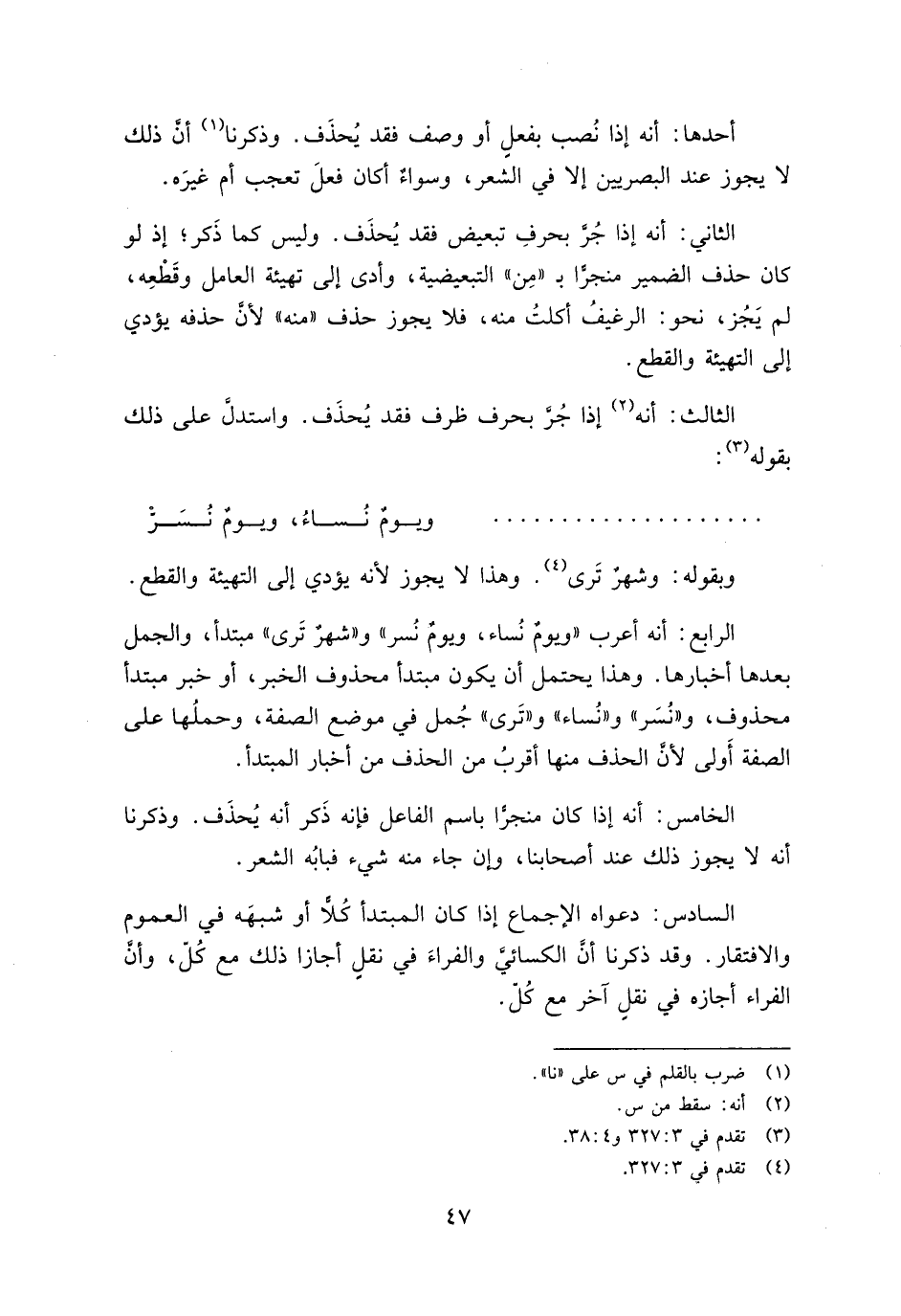 الرابع: أنه أعرب "ويوم نساء، ويوم نسر" و"شهر ترى" مبتدأ، والجمل بعدها أخبارها. وهذا يحتمل أن يكون مبتدأ محذوف الخبر، أو خبر مبتدأ محذوف، و"نسر" و"ترى" جمل في موضع الصفة، وحملها على الصفة أولى لأن الحذف منها أقرب من الحذف من أخبار المبتدأ.