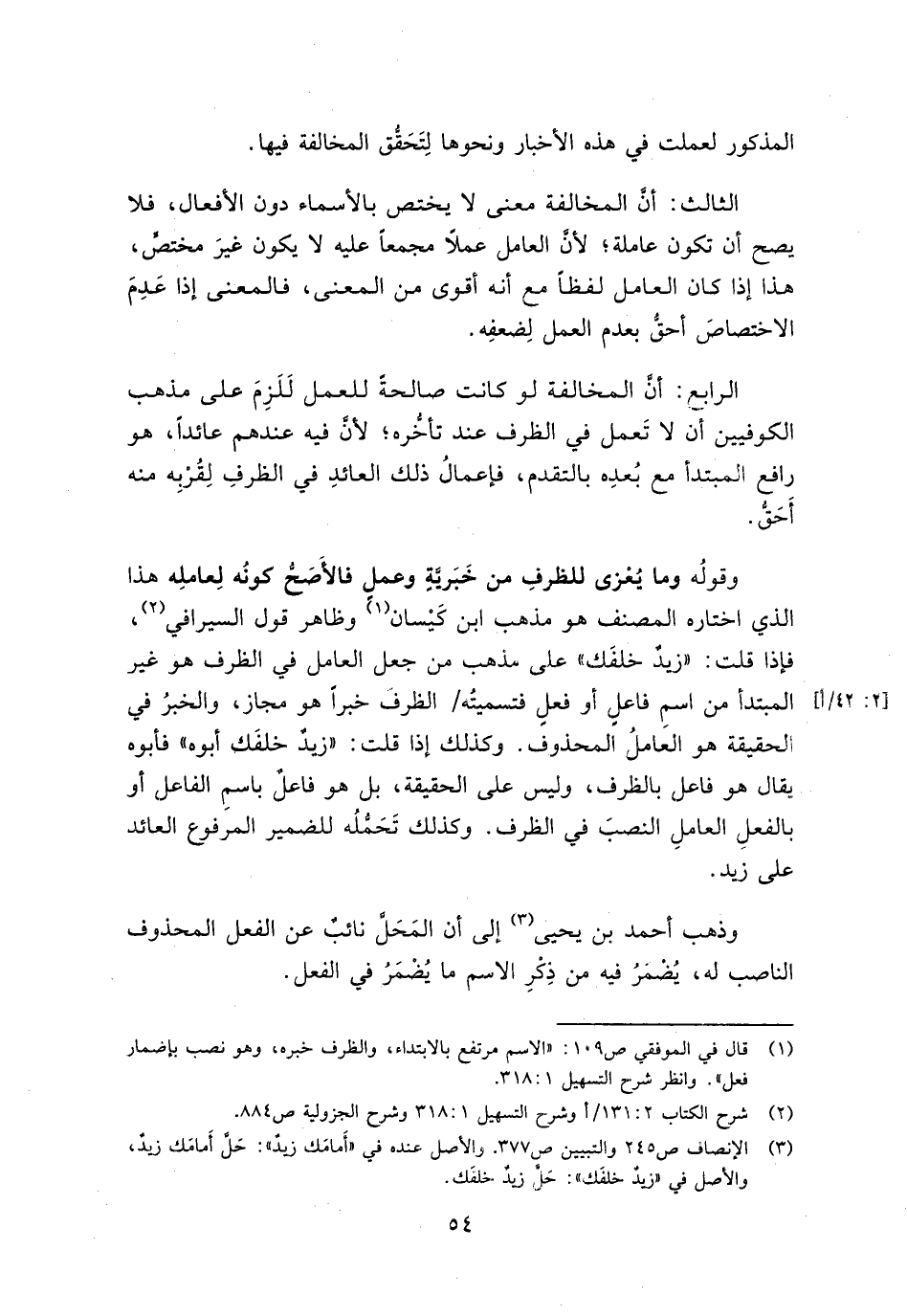الرابع: أن المخالفة لو كانت صالحة للعمل للزم على مذهب الكوفيين أن لا تعمل في الظرف عند تأخره؛ لأن فيه عندهم عائدًا، هو رافع المبتدأ مع بعده بالتقدم، فإعمال ذلك العائد في الظرف لقربه منه أحق.