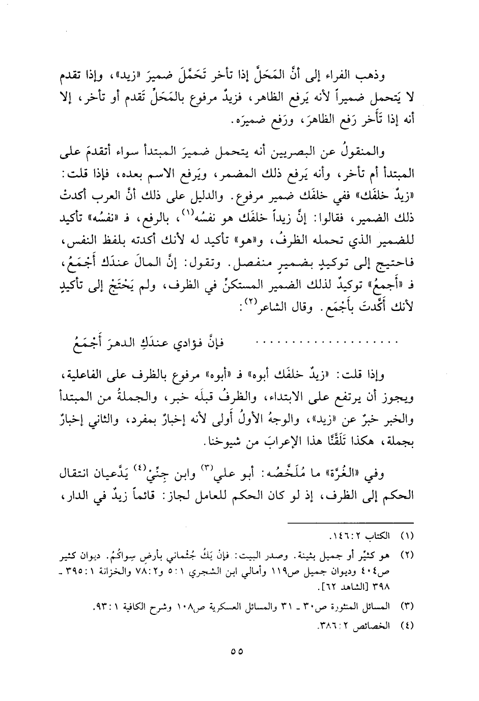 والمنقول عن البصريين أنه يتحمل ضمير المبتدأ سواء أتقدم على المبتدأ أم تأخر، وأنه يرفع ذلك المضمر، ويرفع الاسم بعده، فإذا قلت: "زيد خلفك" ففي خلفك ضمير مرفوع. والدليل على ذلك أن العرب أكدت ذلك الضمير، فقالوا: إن زيدًا خلفك هو نفسه، بالرفع، فـ"نفسه"" تأكيد للضمير الذي تحمله الظرف، و"هو" تأكيد له لأنك أكدته بلفظ النفس، فاحتيج إلى توكيد بضمير منفصل. وتقول: إن المال عندك أجمع، فـ"أجمع" توكيد لذلك الضمير المستكن في الظرف، ولم يحتج إلى تأكيد لأنك أكدت بأجمع. وقال الشاعر: