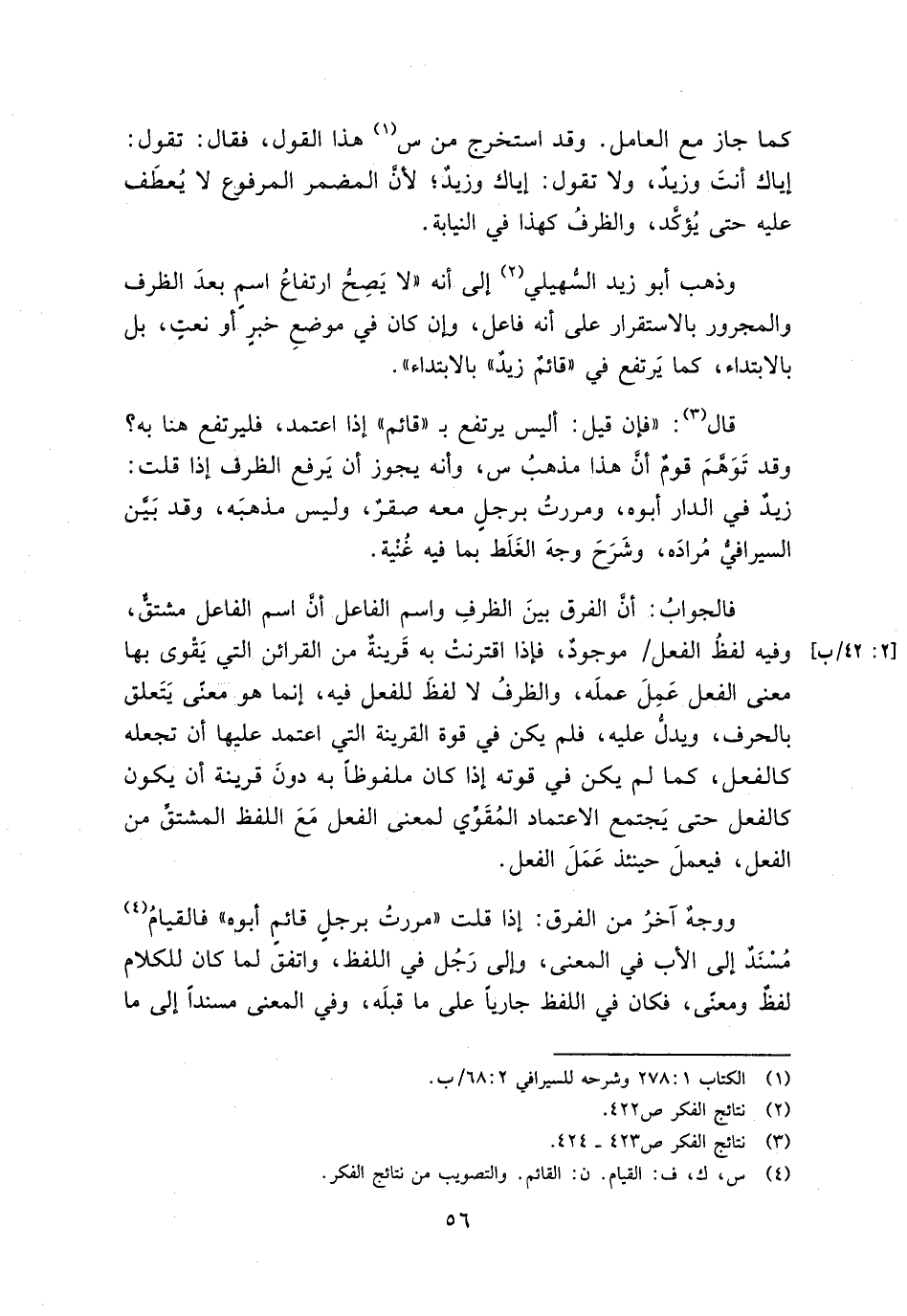 قال: "فإن قيل: أليس يرتفع بـ"قائم" إذا اعتمد، فليرتفع هنا به؟ وقد توهم قوم أن هذا مذهب س، وأنه يجوز أن يرفع الظرف إذا قلت: زيد في الدار أبوه، ومررت برجل معه صقر، وليس مذهبه، وقد بين السيرافي مراده، وشرح وجه الغلط بما فيه غنية.