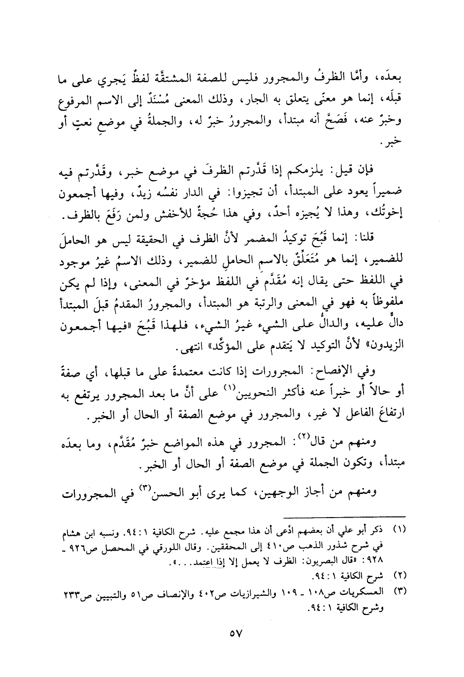 وفي الإفصاح: المجرورات إذا كانت معتمدة على ما قبلها، أي صفة أو حالًا أو خبرًا عنه فأكثر النحويين على أن ما بعد المجرور يرتفع به ارتفاع الفاعل لا غير، والمجرور في موضع الصفة أو الحال أو الخبر.