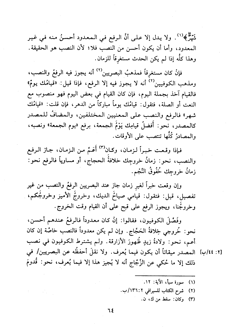 وفصل الكوفيون, فقالوا: إن كان معدودا فالرفع عندهم أحسن, نحو: خروجي خلافة الحجاج. وإن لم يكن معدودا فالنصب خاصة إن كان أعلم, نحو: ولادة زيد ظهور الأزراقة. ولم يشترط الكوفيون في نصب المصدر ميقاتا أن يكون فيما يعرف. ولا نقل أحفظه عن البصريين/ في ذلك إلا ما حكي عن الزجاج أنه لا يجيز هذا إلا فيما يعرف, نحو: قدوم