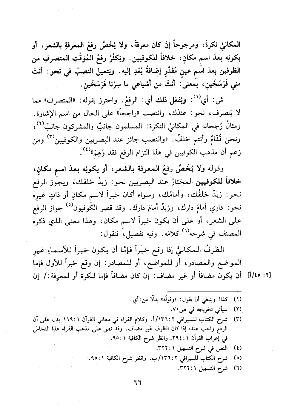 المكاني نكرة, ومرجوحا إن كان معرفة, ولا يخص رفع المعرفة بالشعر, أو بكونه بعد اسم مكان, خلافا للكوفيين. ويكثر رفع المؤقت المتصرف من الظرفين بعد اسم عين مقدر إضافة بعد إليه. ويتعين النصب في نحو: أنت مني فرسخين, بمعنى: أنت من أشياعي ما سزنا فرسخين.