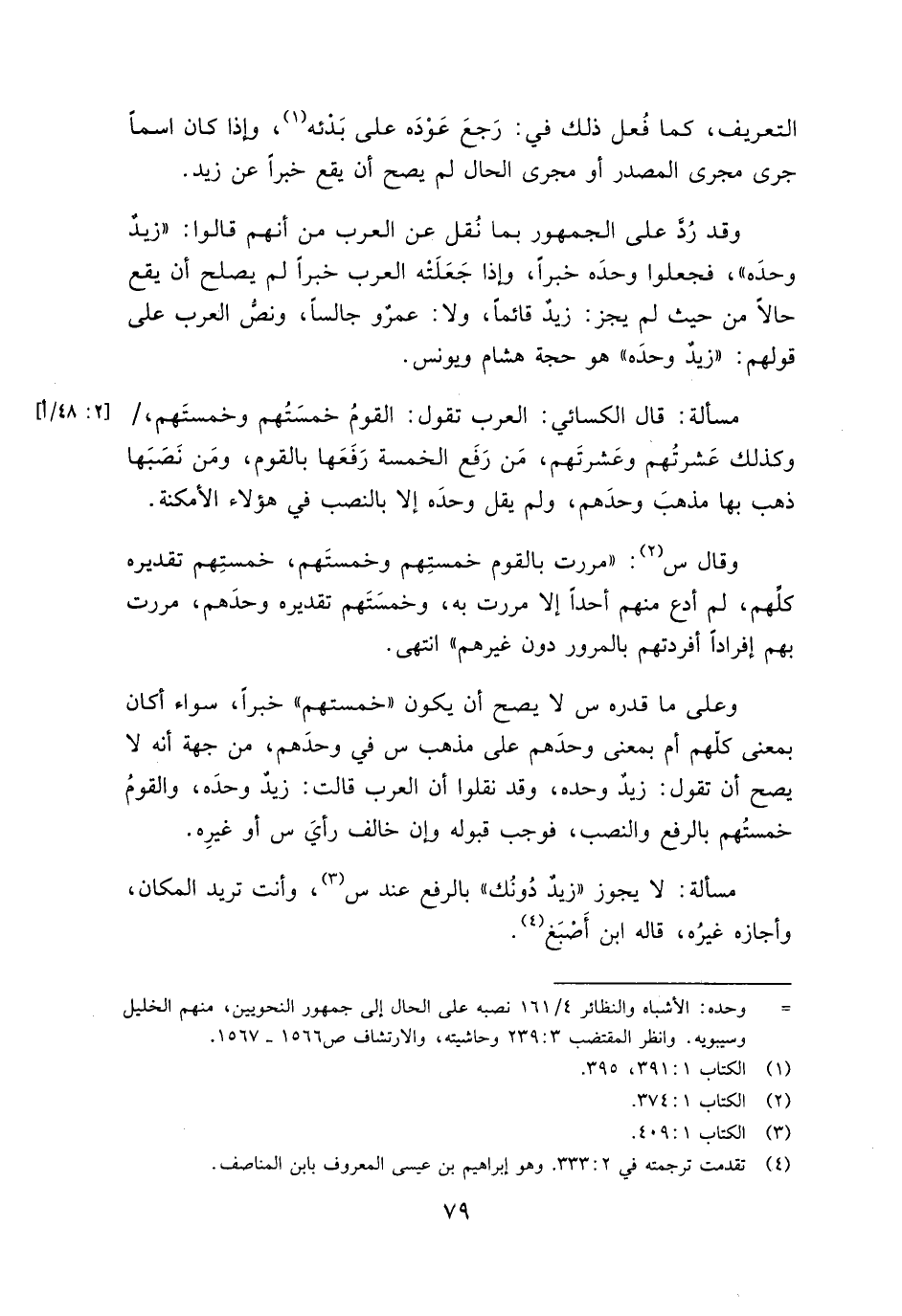 وقد رد على الجمهور بما نقل عن العرب من أنهم قالوا: "زيد وحده", فجعلوا وحده خبرا, وإذا جعلته العرب خبرا لم يصلح أن يقع حالا من حيث لم يجز: زيد قائما, ولا: عمرو جالسا, ونص العرب على قولهم: "زيد وحده" هو حجة هشام ويونس.
