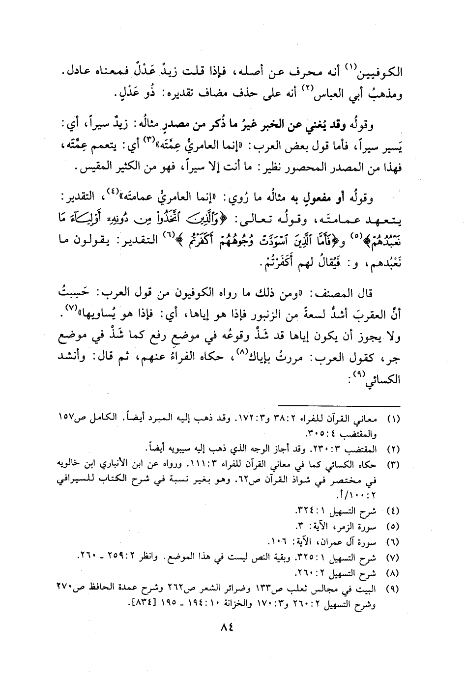 وقوله وقد يغني عن الخبر غير ما ذكر من مصدر مثاله: زيد سيرًا، أي يسير سيرًا، فأما قول بعض العرب: "إنما العامري عنته" أي: يتعمم عمته، فهذا من المصدر المحصور نظير: ما أنت إلا سيرًا، فهو من الكثير المقيس.