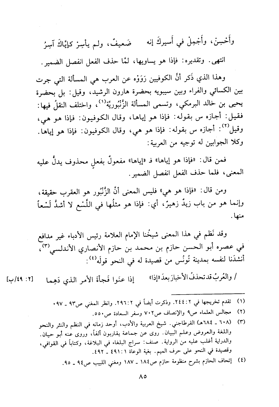 وهذا الذي ذكر أن الكوفيين رووه عن العرب هي المسألة التي جرت بين الكسائي والفراء، وبين سيبويه بحضرة هارون الرشيد، وقيل: بل حضرة يحي بن خالد البرمكي، وتسمى المسألة الزنبورية، واختلف النقل فيها: فقيل: أجازة س بقوله: فإذا هو إياها، وقال الكوفيون: فإذا هو هي، وقيل: أجازه س بقوله: فإذا هو هي، وقال الكوفيين: فإذا هو إياها. وكلا الجوابين له توجيه من العربية: