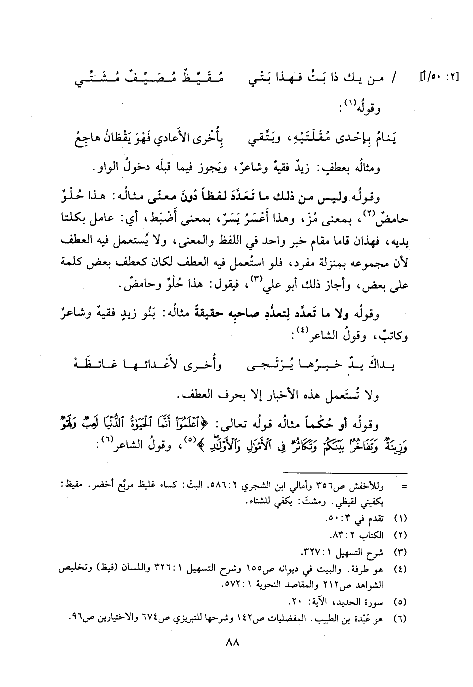 وقوله ولا تعدد لتعدد صاحبة حقيقة مثاله: بنو زيد فقيه وشاعر وكاتب، وقول الشاعر: