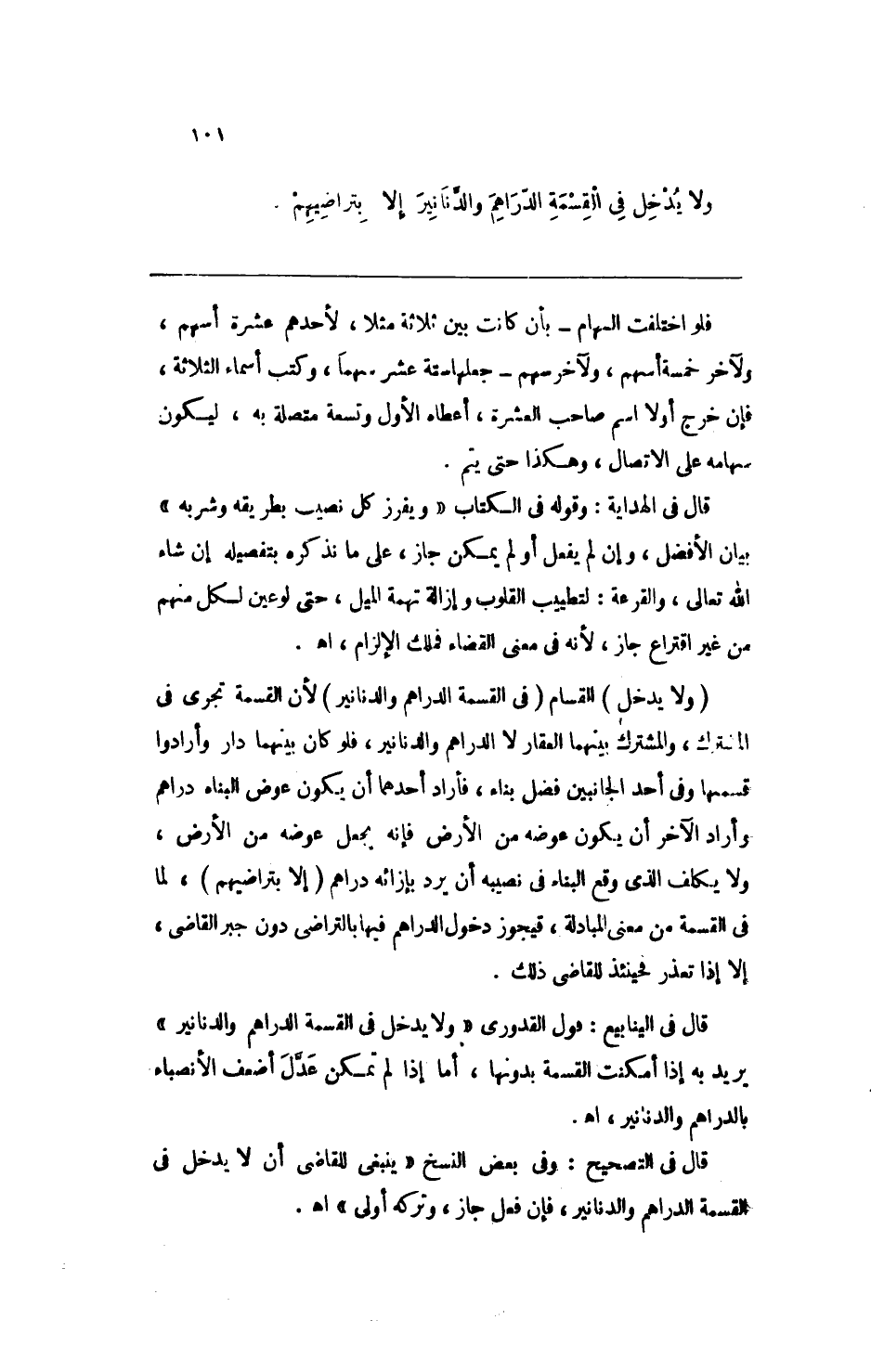 قال في الينابيع: قول القدوري "ولا يدخل في القسمة الدراهم والدنانير" يريد به إذا أمكنت القسمة بدونها، أما إذا لم تمكن عدل أضعف الأنصباء بالدراهم والدنانير، اهـ.