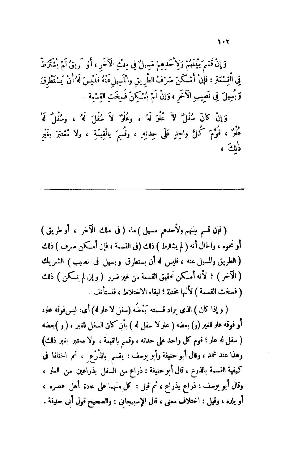 (وإذا كان) الذي يراد قسمته بعضه (سفل لا علو له) أي: ليس فوقه علو، أو فوقه علو للغير (و) بعضه (علو لا سفل له) بأن كان السفل للغير، (و) بعضه (سفل لا علو؛ قوم كل واحد على حدته، وقسم بالقيمة، ولا معتبر بغير ذلك) وهذا عند محمد، وقال أبو حنيفة وأبو يوسف: يقسم بالذرع، ثم اختلفا في كيفية القسمة بالذرع، قال أبو حنيفة: ذراع من السفل بذراعين من العلو، وقال أبو يوسف: ذراع بذراع، ثم قيل: كل منهما على عادة أهل عصره، أو بلده، وقيل: اختلاف معنى، قال الإسبيجاني: والصحيح قول أبي حنيفة
