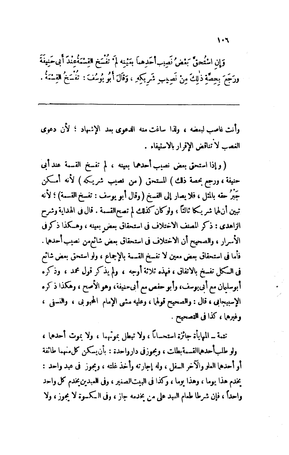 (وإذا استحق بعض نصيب أحدهما بعينه، لم تفسخ القسمة عند أبي حنيفة، ورجع بحصة ذلك) المستحق (من نصيب شريكه) لأنه أمكن جبر حقه بالمثل، فلا يصار إلى الفسخ (وقال أبو يوسف: تفسخ القسمة) ؛ لأنه تبين أن لهما شريكا ثالثاً، ولو كان كذلك لم تصح القسمة. قال في الهداية وشرح الزاهدي: ذكر المصنف الاختلاف في استحقاق بعضٍ بعينه، وهكذا ذكر في الأسرار، والصحيح أن الاختلاف في استحقاق بعض شائع من نصيب أحدهما. فأما في استحقاق بعض معين لا تفسخ القسمة بالإجماع، ولو استحق بعض شائع في الكل تفسخ بالاتفاق، فهذه ثلاثة أوجه، ولم يذكر قول محمد، وذكره أبو سليمان مع أبي يوسف، وأبو حفص مع أبي حنيفة، وهو الأصح، وهكذا ذكره الإسبيجاني، قال: والصحيح قولهما، وعليه مشى الإمام المحبوبي، والنسفي، وغيرهما، كذا في التصحيح.