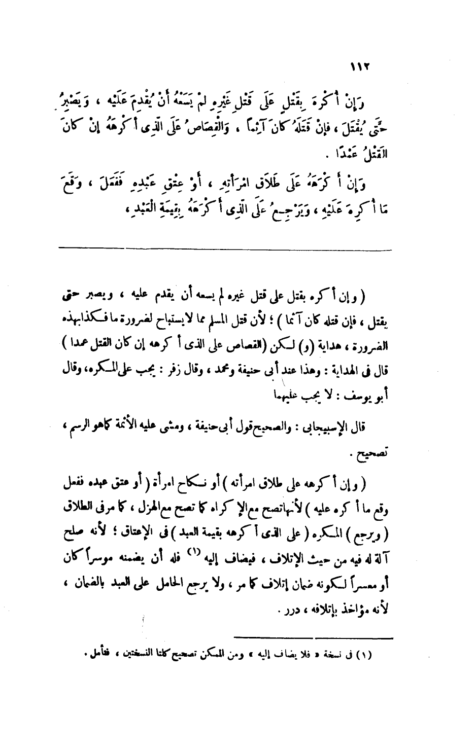 (وإن أكره بقتل على قتل غيره لم يسعه أن يقدم عليه، ويصبر حتى يقتل، فإن قتله كان آثما) ؛ لأن قتل المسلم مما لا يستباح لضرورة ما فكذا بهذه الضرورة، هداية (و) لكن (القصاص على الذي أكرهه إن كان القتل عمدا) قال في الهداية: وهذا عند أبي حنيفة ومحمد، وقال زفر: يجب على المكره، وقال أبو يوسف: لا يجب عليهما.